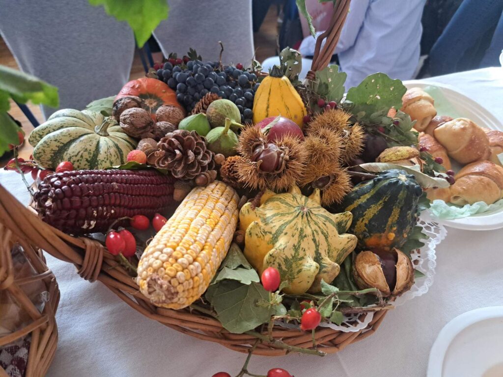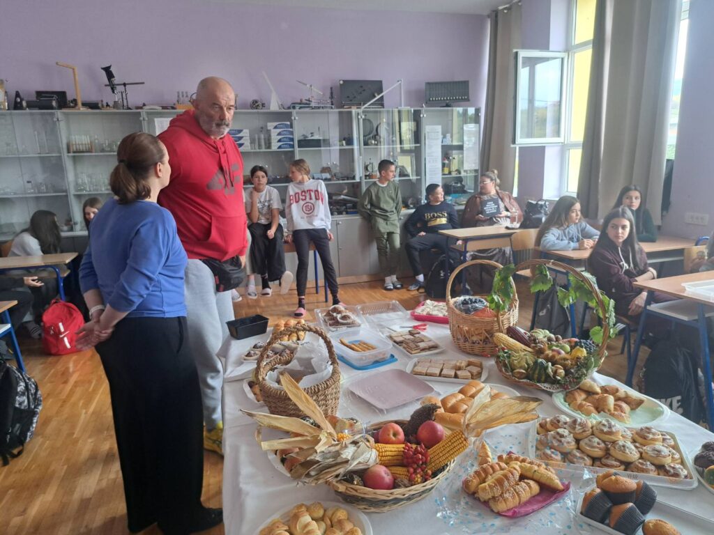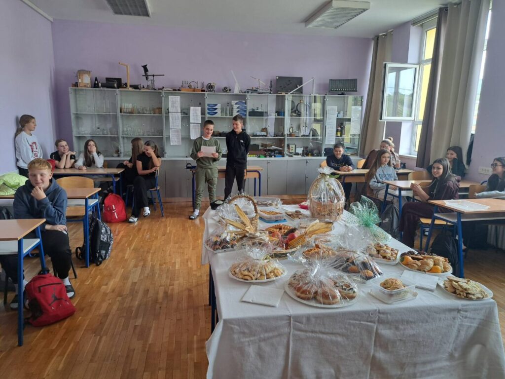 Dani kruha i zahvalnosti za plodove zemlje trenutak je kada se s posebnim poštovanjem prisjećamo darova koje nam priroda pruža. Tim povodom učenici 7. B razreda su na satu razrednika ugostili učenike i razrednika 8. B prof. Krešimira Lončara te ravnatelja škole Milorada Bandala, psihologinju Slavicu Bilić te knjižničarku Martinu Nikolić. Sat je započeo uz nekoliko prigodnih riječi o razlogu našeg okupljanja, a zatim je uslijedilo čašćenje s mnoštvom raznolikih slastica – slanih i slatkih. Vrijedne ruke naših učenika i roditelja obogatili su prekrasno dekoriran stol, a cjelokupni dojam upotpunili su jesenji plodovi.