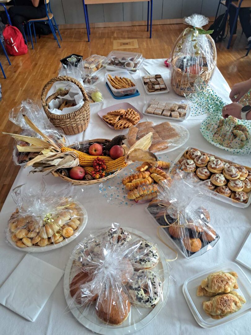 Dani kruha i zahvalnosti za plodove zemlje trenutak je kada se s posebnim poštovanjem prisjećamo darova koje nam priroda pruža. Tim povodom učenici 7. B razreda su na satu razrednika ugostili učenike i razrednika 8. B prof. Krešimira Lončara te ravnatelja škole Milorada Bandala, psihologinju Slavicu Bilić te knjižničarku Martinu Nikolić. Sat je započeo uz nekoliko prigodnih riječi o razlogu našeg okupljanja, a zatim je uslijedilo čašćenje s mnoštvom raznolikih slastica – slanih i slatkih. Vrijedne ruke naših učenika i roditelja obogatili su prekrasno dekoriran stol, a cjelokupni dojam upotpunili su jesenji plodovi.