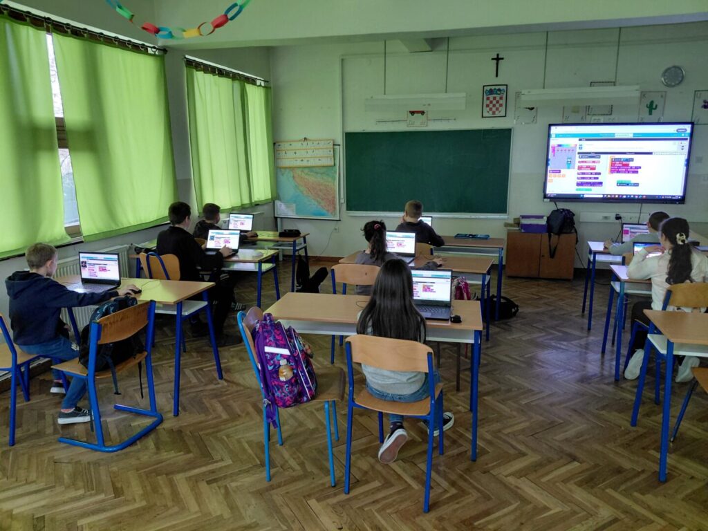 Sudjelovali su u zanimljivoj aktivnosti pod nazivom Dance Party: AI Edition, čiji je cilj bio upoznati učenike s osnovama programiranja i umjetne inteligencije na zabavan i kreativan način te time razvijati digitalne kompetencije, logičko razmišljanje i kreativnost. Tijekom jednog školskog sata učenici su, uz glazbu i veselu atmosferu, kreirali vlastiti plesni „party“ koristeći programiranje pomoću blokova. Aktivnost je osmišljena tako da potiče maštu i kreativnost – učenici su birali glazbu, dodavali plesne pokrete i vizualne efekte, a sve uz pomoć AI Bota koji im je predlagao efekte prema raspoloženju pjesme.